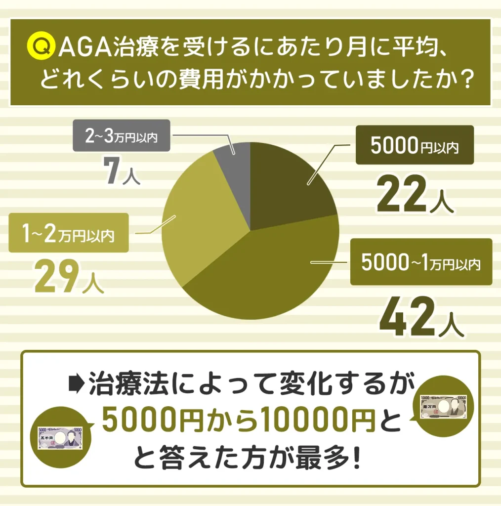 AGAの治療料金は治療法によって異なりますが基本的には診察料、薬代、検査代などの合計金額になってきます。100人のAGA治療経験者へのアンケート結果では月額費用が5,000円から10,000円ほどと回答した方が42人と最も多く、10,000円から20,000円が29人、5,000円以内が22人と続きました。