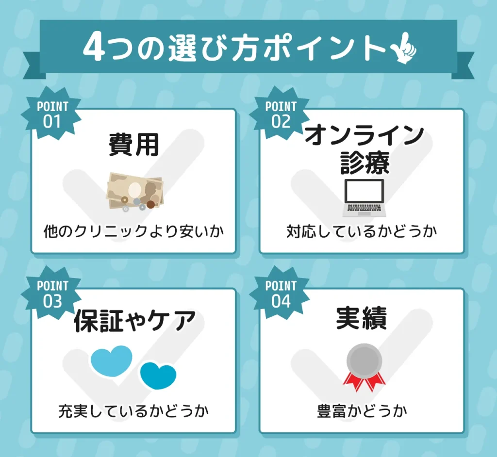 AGA治療で後悔しないためにAGA治療のクリニックを選ぶ際には、以下のポイントをチェックしましょう。