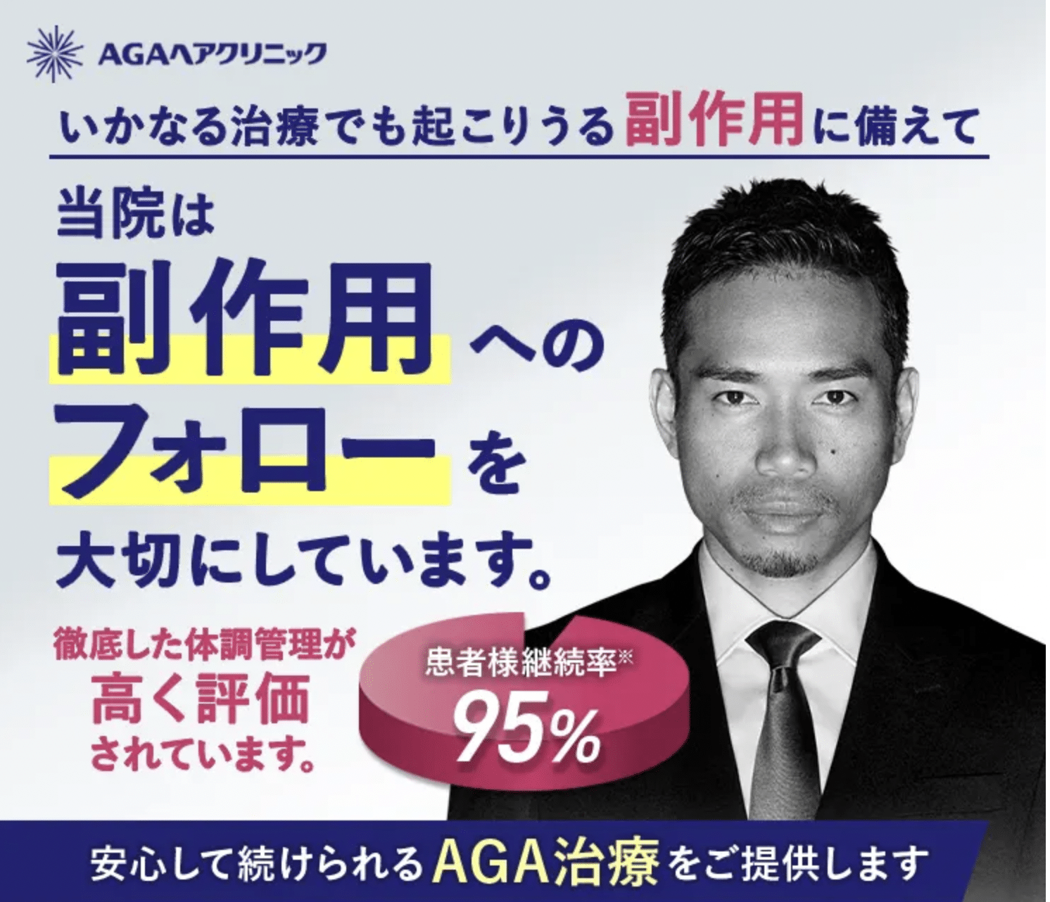 また、AGAは完治しないため、治療を継続して行う必要があります。これはAGA治療が男性型脱毛症の進行を防ぐ治療であるためです。治療を途中でやめてしまうと男性型脱毛症の進行がふたたび再開し、薄毛にもどってしまう可能性もあります。