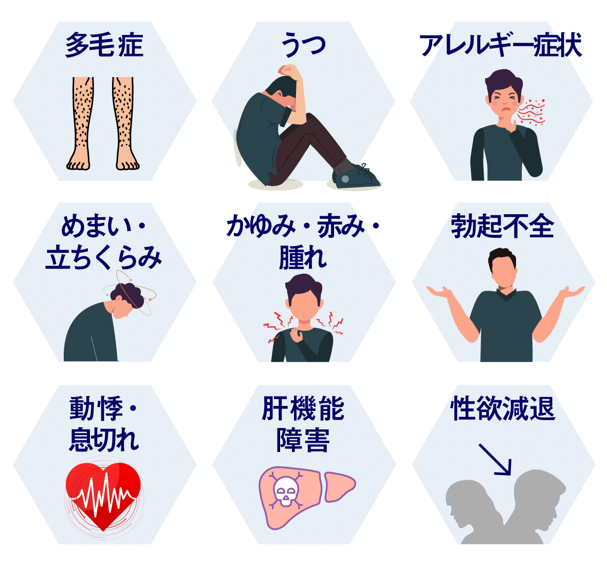 また、副作用として報告されている症状は性欲減退、多毛症、勃起不全、食欲不振、頭皮のかゆみ、肝機能障害、倦怠感などが挙げられます。