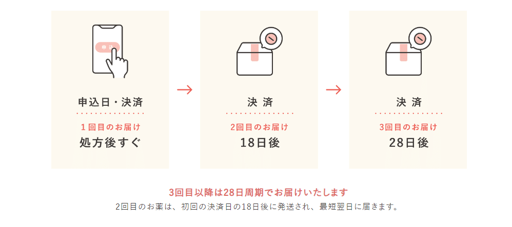 定期配送のスケジュールとしては、1回目のお届けは処方後すぐ、2回目のお届けは18日後、3回目のお届けは28日後周期となります。