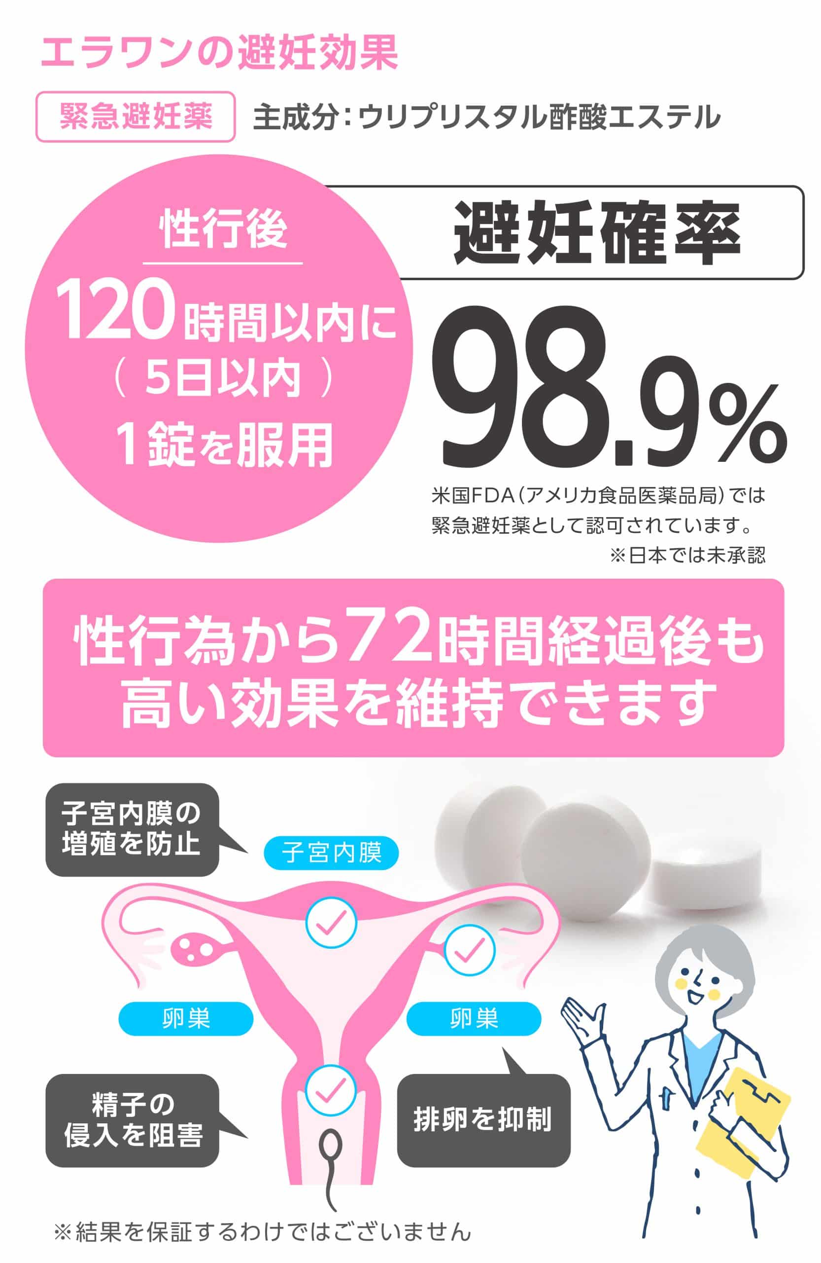 エラは行為後120時間以内に1錠服用することにより避妊薬を期待できるアフターピルで、子宮内の環境を大きく変える有効成分・ウリプリスタール酢酸エステルが含まれています。