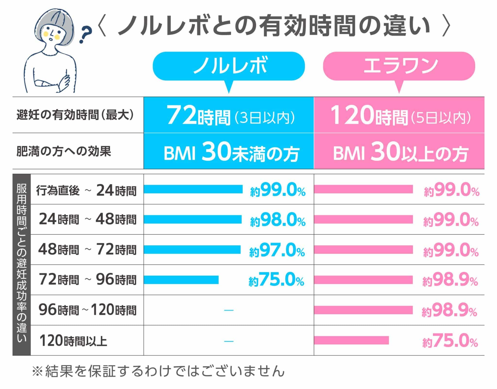 エラはレボノルゲストレル法よりも高い避妊効果を期待できるほか、行為から時間が経過しても避妊効果が下がりにくいのも魅力です。しかもBMIの値が30未満の人に効果を発揮するレボノルゲストレル法とは違い、BMIの値が30以上の肥満である人にも高い効果を期待できます。