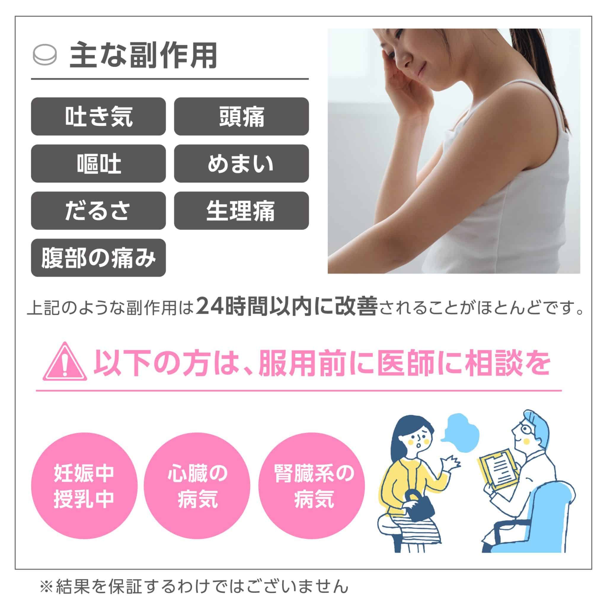エラ錠の副作用には不正出血や消退出血、頭痛、吐き気、倦怠感、腹痛、生理痛、めまいなどがあり、他のアフターピルに比べて少ない傾向にありますが、まったくないわけではありません。
